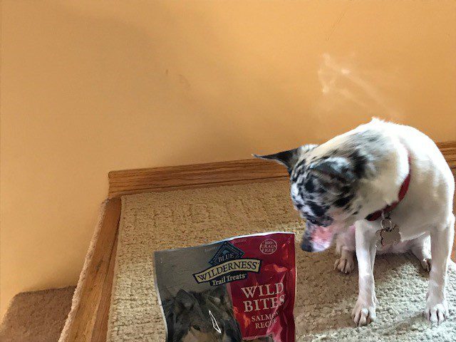 Remedy’s favorite treats are Blue Wilderness Trail Treats, they are soft enough to easily break into smaller pieces. These are the Wild Bites, salmon flavor, but she likes them all. They also have grain-free treats.